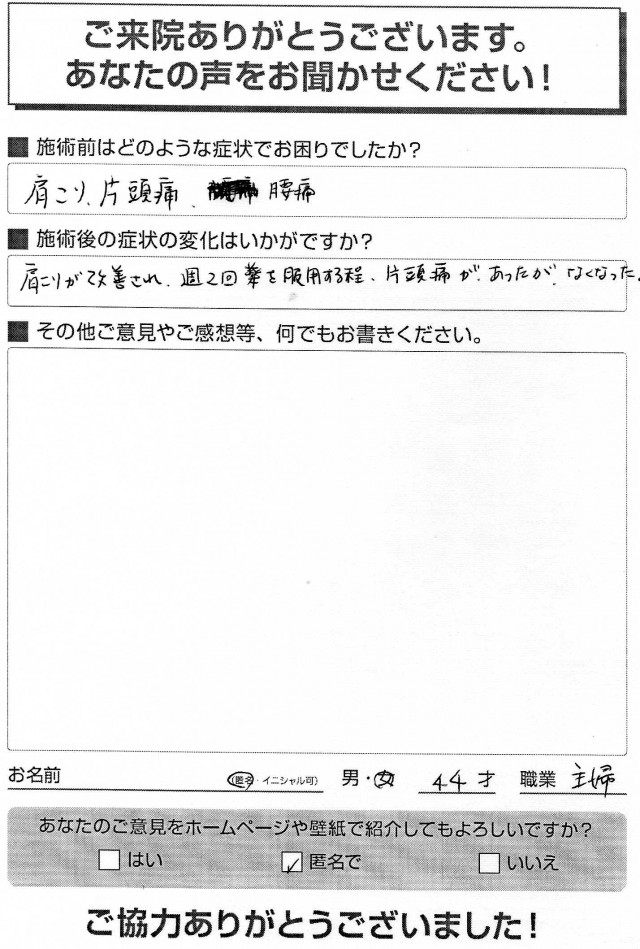 肩こりが改善され、週2回程薬を薬を服用する程片頭痛があったがなくなった