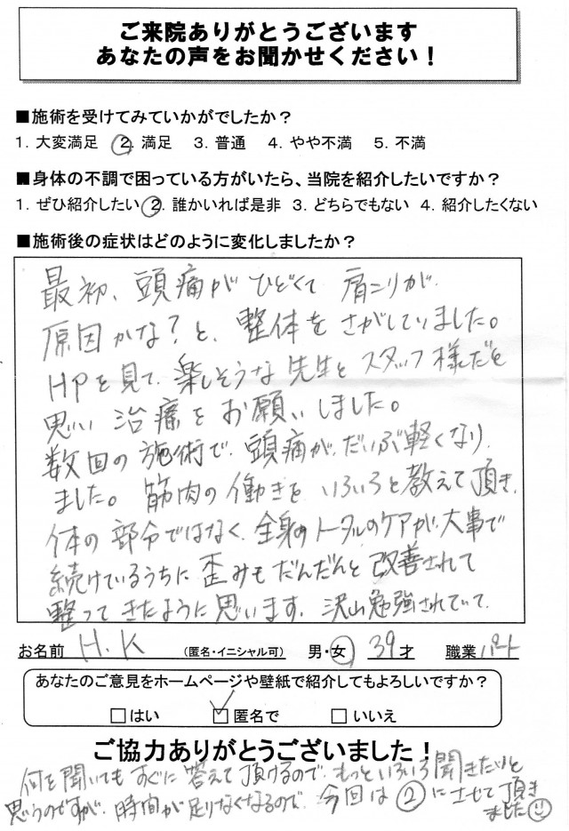 最初、頭痛がひどくて肩こりが原因かな?と、整体をさがしていました。