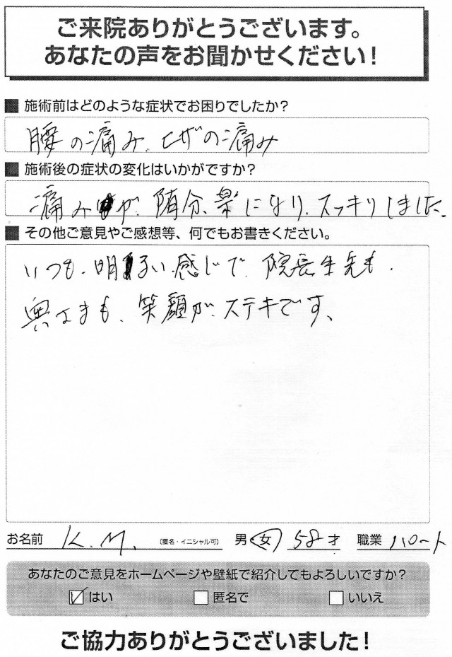 先生の施術や励ましのお陰で心も身体もスッキリしています。ありがとうございます。