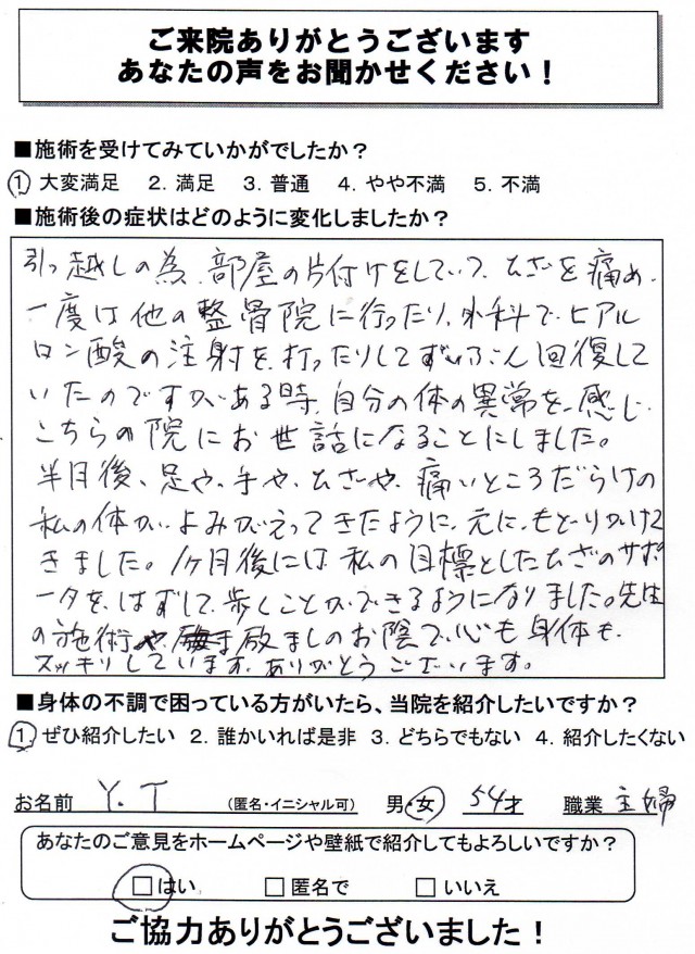 引っ越しの為、部屋の片付けをしていて、ひざを痛め、一度は他の整骨院に行ったり、外科でヒアルロン酸の注射を打ったりしてずいぶん回復していたのですが、ある時、自分の体の異常を感じこちらの院にお世話になることにしました。