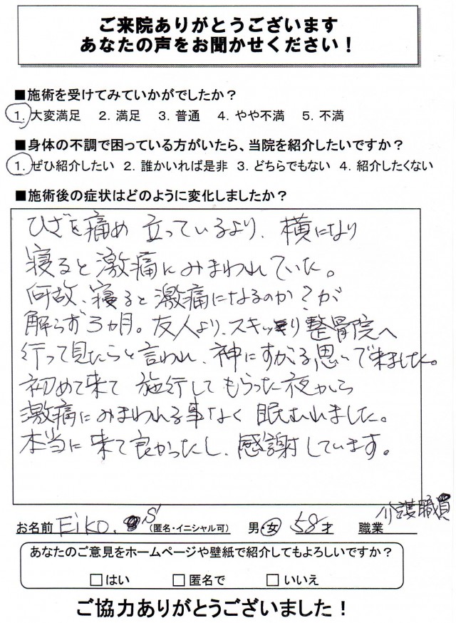 初めて来て施行してもらった夜から激痛にみまわれる事なく眠れました。