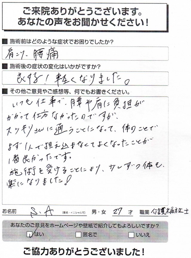 いつも仕事で腰や肩に負担がかかって仕方なかったのですが、スッキリさんに通うことになって、体のことがまず一人で抱え込まなくてよくなったことが一番良かったです。