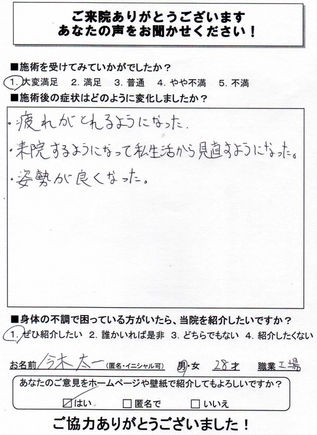 ご自身のお体のケアに真面目に取り組んで頂いたため、良い状態になって頂いております。引き続き健康のために当院をご利用頂けましたら有難いです。