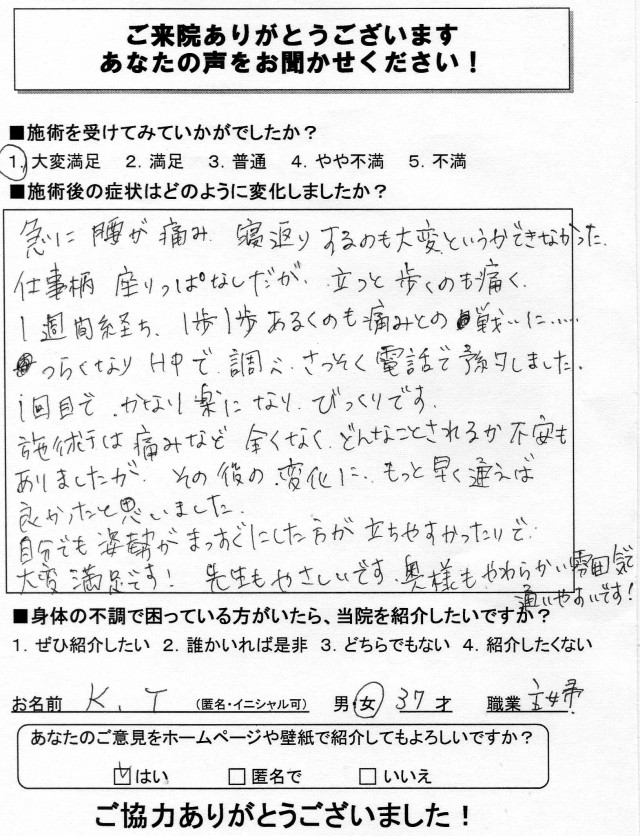 治療後、ギックリ腰も改善 体温も36度5分になりました。