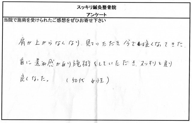 首に違和感があり施術していただきスッキリと戻り良くなった(50代女性)