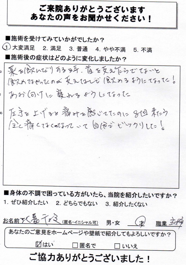 Hさん大病を患われているにも関わらず、来院時はいつもにこやかに振舞って頂き、逆に元気を頂いている気分になれます。肩こりや首の痛み・腰痛が解消されてきただけでなく、大病にも変化の兆しが出てきたため、大変有難いことです。