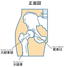 股関節は、大腿骨(だいたいこつ)の上端にある骨頭(こっとう)と呼ばれる球状の部分が、骨盤の寛骨臼(かんこつきゅう)と呼ばれる受け皿にはまり込むような形になっています。