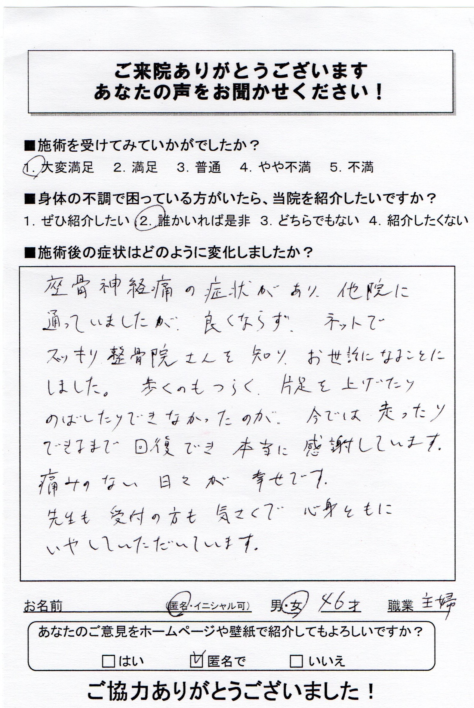 坐骨神経痛がスッキリし、心身ともにいやしていただいています