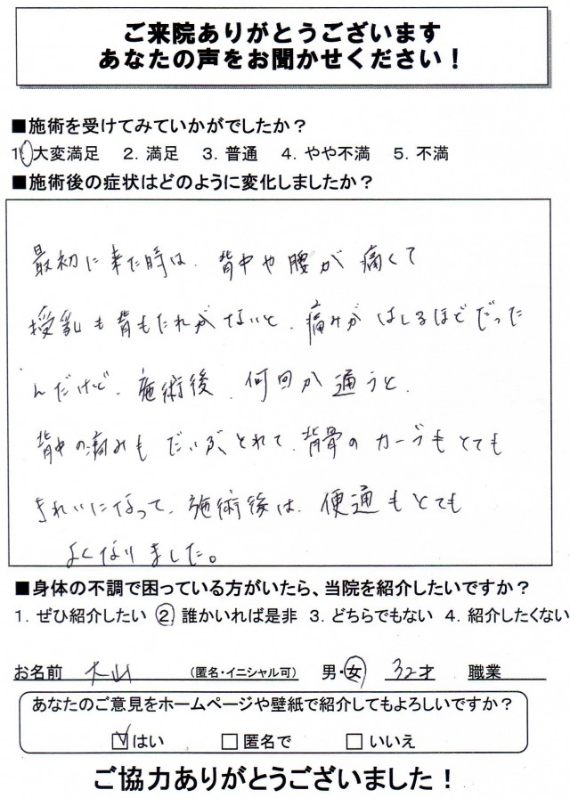 妊娠中から背中が痛かった大山様ですが、指導通りきちんと通院してくれたお陰で背中や腰の痛みも随分解消されてくれたためとても有難いです。オマケ効果として便秘まで解消されて良かったですね。